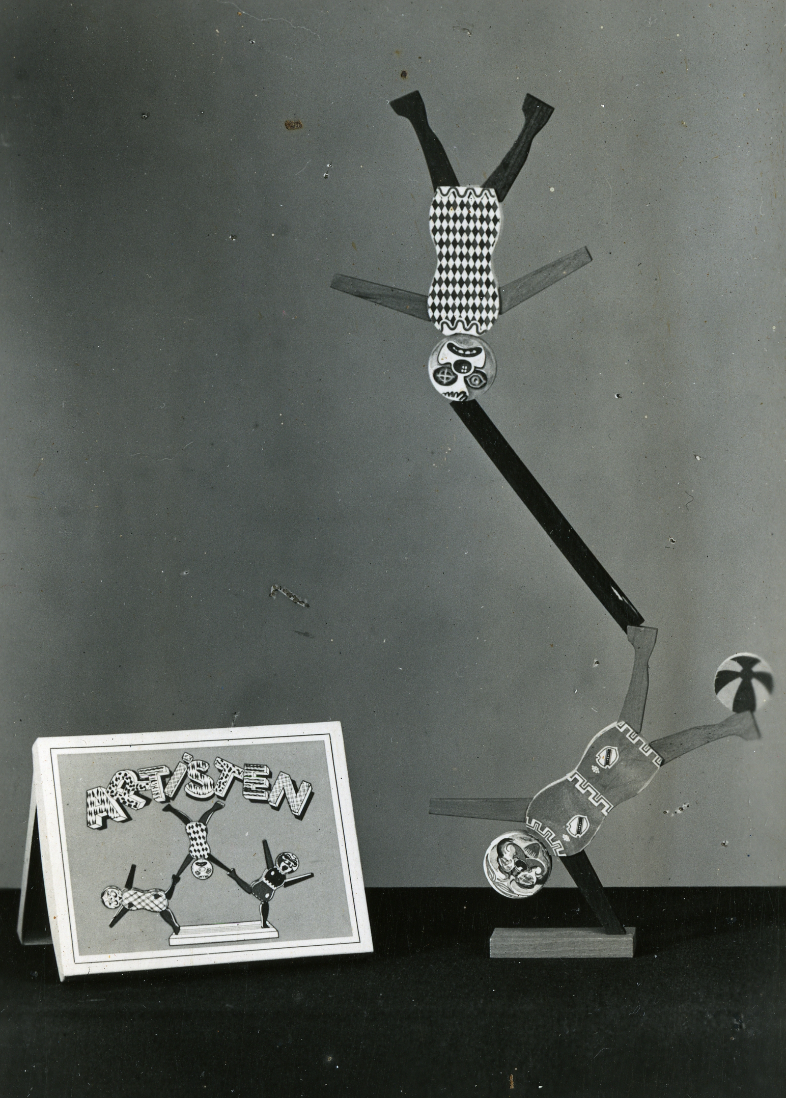 Consists of 2 figures with loose arms, legs and head. Also 1 ball, 1 plinth, 1 batten